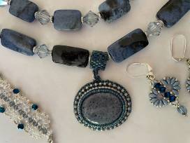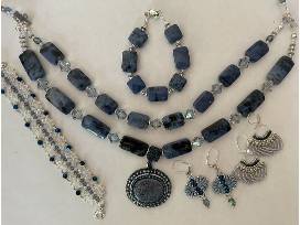 Jewelry set consisting of: one two-strand necklace of blue durmortierite beads with a beaded cabochon pendant, measuring 21.5", expandable to 24.5"; two bracelets to fit a 6 3/4" wrist; two pairs of leverback earrings for pierced ears. All findings are silver metal.