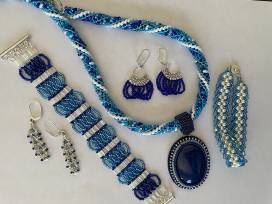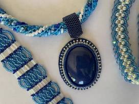 Jewelry set consisting of: one spiral rope necklace with a navy blue beaded cabochon pendant, measuring 19.5", expandable to 22"; two bracelets of glass pearls and crystals to fit a 7 3/4" wrist; two pairs of leverback earrings for pierced ears. All findings are silver metal.