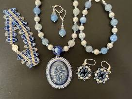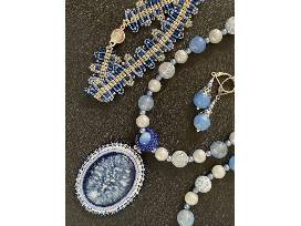 Jewelry set consisting of: one necklace of Crackle Agate beads and glass pearls, with a beaded cabochon pendant, measuring 19 1/2", expandable to 22 1/2"; two bracelets to fit a 7 3/4" wrist; two pairs of leverback earrings for pierced ears. All findings are silver. metal.