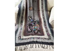 Indian handmade wool scarf or wrap, 72" x 32", embroidered with crewelwork in various colors. Background of brown, black and gray with purple and turquoise stitching.