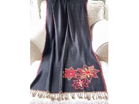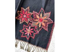 Indian handmade wool scarf or wrap, 72" x 32", embroidered with machine stitched motifs in reds and oranges. Base fabric is black with tiny flecks of color.