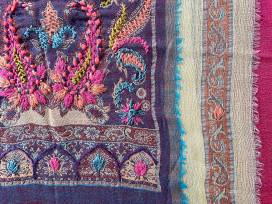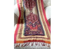 Indian handmade sheer wool scarf or wrap, 72" x 32", embroidered with crewelwork in various colors. Multi-colored background of orange/red/beige with complementary stitching.