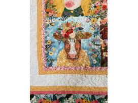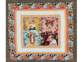 Baby quilt measuring 38" x 34", in bright peach, yellow and blue print with multiple borders outlining a panel of four cute farm animals. Machine pieced and quilted.