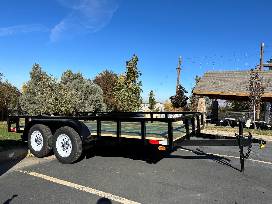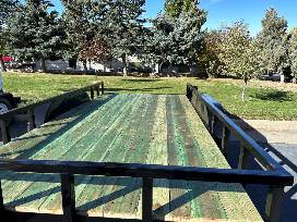 - Flatbed trailer with rails that measures 14' X 7'