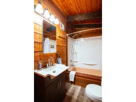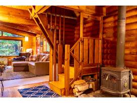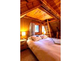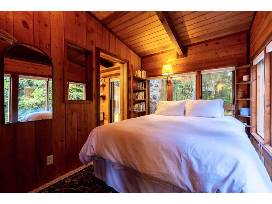 The main bedroom has queen bed with en-suite bathroom (with bathtub/shower combo). Surrounded in windows, you feel like you are sleeping in the trees.