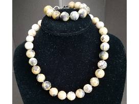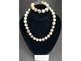 This exclusive piece is entitled Green Goddess Dressing. It includes an 18" necklace and 8" bracelet/extender of natural pale green turquoise with black seed bead "knots" and Indonesian sterling fishhook clasps.