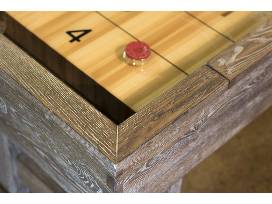 What else can we say about this unique rustic and industrially inspired shuffleboard? The heavy metal stretchers and distressed solid raised grain ash wood gives the table a unique look that not only has old world charm with real finger jointed cabinetry but also a very contemporary feel by incorporating metal in the design.