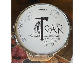 Autographed snare drum by O.A.R. band members with a hand drawn Tomahawk/O.A.R. sketch by lead singer Marc Roberge.