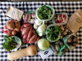 Thanksgiving Bounty Box from One Farm is your means to creative locally sourced Thanksgiving dinner. Includes several storage items such as winter squash, garlic, onions, red beets, winter squash, garlic, onions, white Kennebec or russet potatos , cabbage, dried herbs, radishes, and red or yellow potatoes. All locally sourced.