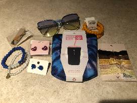 Accessories from Twisted Sisters Boutique including: Tote Bag, Sunglasses, bracelet set, hair clip, 2 sets of earrings, hair ties, and a Java Sok.