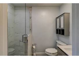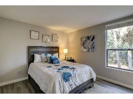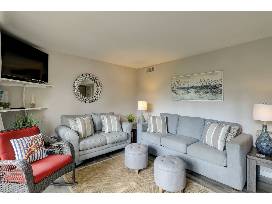 The Primary Bedroom is furnished with a Queen Bed, a large Flat Screen Smart TV & a Private Bath with Glass Shower.