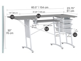 This sewing machine table creates a 60.5" wide table top when you expand the 13" drop leaf. The three metal mesh drawers keep your supplies close and visible while you work.