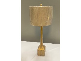 A gold distressed lamp base with a linen shade.