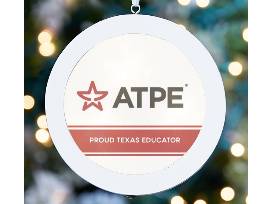 The customized LED light ornament will show off your ATPE pride throughout the holiday season! The painted wood frame features the red and black ATPE logo on a transparent background with "Proud Texas Educator" on a red accent banner. Turn on the LED lights in the back of the ornament to disperse soft light throughout the decorative screen. The ornament measures 4.5" in diameter with 1" thickness. It comes with a white hanging ribbon and three LR44 batteries.