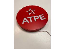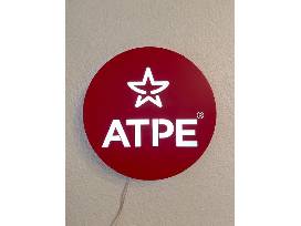 Show your ATPE pride with this custom-made red metal backlit sign that will brighten your day and your space. The backlit light box is made of red painted metal and acrylic and is illuminated from within by a white LED light. The package includes a power adapter and plug, a dimmer to choose your level of brightness, and installation necessities for hanging the sign. Pictures show the light turned off, dimmed at darkest setting, and at full brightness. Sign measures 12" in diameter and 1.625" thick. This item has a one-year warranty.