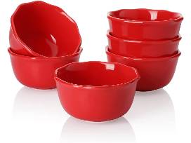 The set of six ATPE-red porcelain ice cream bowls from Sweese have a stylish flower shape and are made from durable porcelain that is lead-free, chip-resistant, and sturdier than stoneware. Each stackable bowl holds up to 10 oz. of ice cream or other snacks. Safe for the dishwasher, microwave, freezer, and oven.