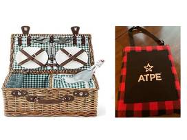Everything you need for an ATPE picnic, this package includes an ATPE-logo picnic blanket and fully stocked picnic basket. The 4 x 5' red and black checkered blanket zips up for convenient transport with sturdy handles. The latching wicker picnic basket has an insulated section to keep food and drinks cold and comes with four porcelain plates, four wine glasses, four sets of stainless steel flatware, and a corkscrew.