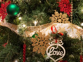 0This tree has red and green ornaments, icicles and snowflakes, with a lovely white & gold ribbon swirled around. It is accented with the words celebrating the season: Love, Peace, Faith & Joy.