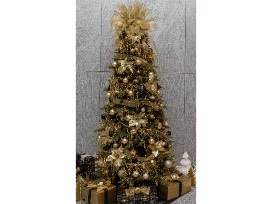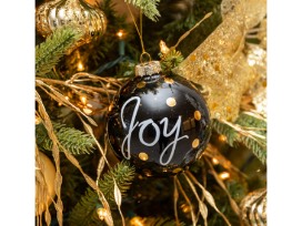 1Inspired by a single "Joy" ornament, this tree drips and sparkles with gold, offset by the occasional black accent and one Carolina Chickadee.