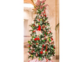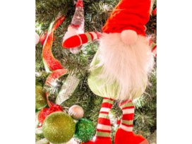 Red and white candy cane striped spirals explode with whimsy from the top of this tree! A rascal gnome, a gnome Christmas stocking and a gnome treasure box are nestled into this tree, along with red, white, and electric green colored ornaments. An adorable red polka-dotted tree skirt completes this tree's fun, festive look.
