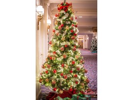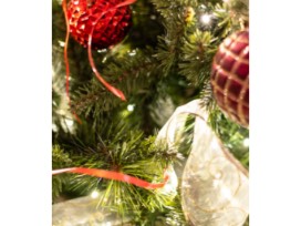 0Red and gold bells adorn the top of this tree, with glittering gold and red ornaments and translucent ribbons shimmering down the branches.
