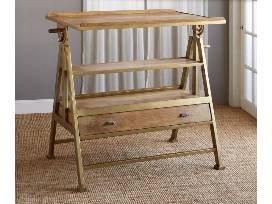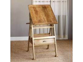 Small Lewis Drafting Table. Sure to become a cherished heirloom in your home or office, employ this sturdy, handcrafted, wood and brass-colored iron drafting table as a desk, art studio or display space. Adjustable tilt, with a shelf and drawer underneath for storage. Imported. Small, overall with table tilted up like the image, 25"W x 25-1/2"D x 55-1/2"H, tabletop, 24-1/2"W x 24"H, with table flat, 44"H.