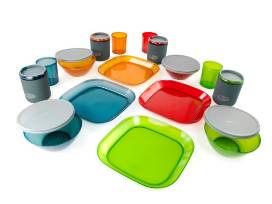 The Infinity 4 Person Deluxe Tableset consists of completely recyclable, BPA-Free polypropylene that won't absorb odors or leak chemicals into your food. This set includes 4 nesting bowls, 4 insulated mugs with Sip-It lids, and 4 large plates, and it all comes in a compact mesh stuff sack.