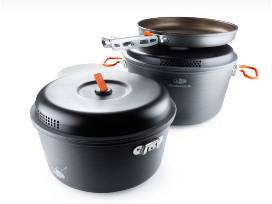 These durable, non-stick coated, hard anodized aluminum pots are the ultimate in design, space efficiency, and cooking performance. Every set includes 2 pots, a frypan, 2 nylon strainer lids, a cutting board for a variety of prep duties, a folding pot handle, and a welded stuff sack to keep everything organized and doubles as a sink for washing.