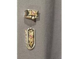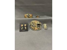 - Large Cutter design buckle set made in Australia in 1993, consisting of 3 pieces: buckle, post, & loop. Set has a black enamel background with silver and copper filigree accented with flowers.