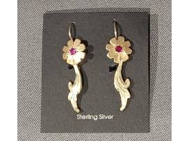 - Floral earrings with sterling silver and tricolor metals and red stone centers.