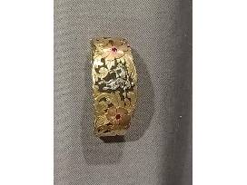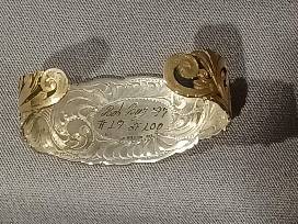 - Medium cuff bracelet made in Australia in 1993. Has a black enamel background and tricolor metals: sterling silver, brass and copper filigree.