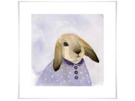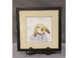 Watercolor painting of a whimsical rabbit by Paula Lay. 13" x 13" black framed and matted.