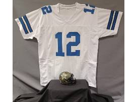 Dallas Cowboys' own Roger Staubach, autographed, XL White Jersey, #12 & Salute to Service mini-helmet, autographed. Both from Beckett Witnessed.