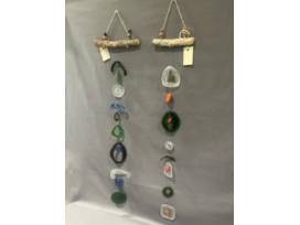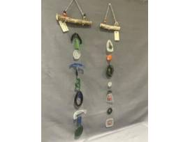 Two single-strand fused glass chimes/suncatchers. Made from recycled bottles, cut into rings and kiln-fired to 1400 degrees.