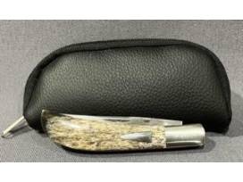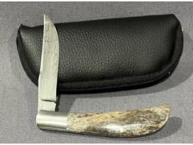 Single-blade trapper, clip point blade, Del Ealy Carbon t-Rex Damascus bolsters and lines. Dyed giraffe bone handle.