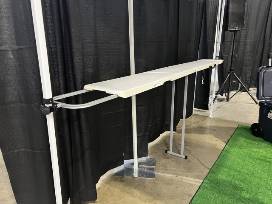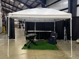 Ozark Trail 8 ft. extendable tailgate table, white. 92.5 in x 12 in x 39 in, and Ozark Trail 10' x 10' straight-leg canopy with wheeled carrying case.