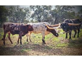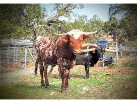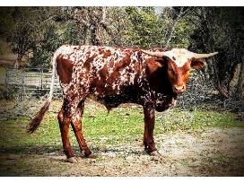 Registered Texas Longhorn Steer calf with great genetics. Here is your chance to own some of the most favorable genetics in the Texas Longhorn cattle industry without breaking the bank. The Sire for this calf has beautiful colors with horns to match. The sire (see photo) is "KCA O' Rio Grande", and was 82.5 inches TTT at 38 months old and was 85 inches TTT at 49 months old. The genetics are from Bubba Tuff Chex, Cowboy Tuff Chex, Concealed Weapon, Hubbells Rio Glory, & Hubbells 20 Gauge.