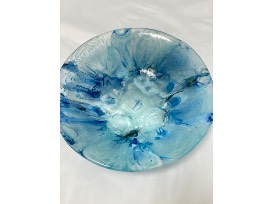 Deep fused glass bowl with swirls of clear, aqua, blue and white glass.. Approximately 11" x 11" x 2".