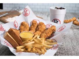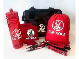 Slim Chickens merch includes Basecamp hammock, Koozie lunch bag, 4- drink koozies, water bottle, 4- pens and 3- keychains.