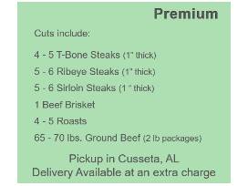 **A typical ΒΌ cow will be 110-120 lbs. of edible beef consisting of 4-5 T-Bones Steaks(1" thick), 5-6 Ribeye Steaks(1" thick), 5-6 sirloin steaks(1" thick), 1 Beef Brisket, 4-5 Roasts and 65-70 lbs of ground beef packaged in 2 lbs packs.