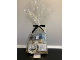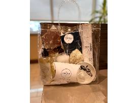 A clear bag filled with Sea Salt Incenses, Simply Perfect body wash and Lotion, a glass butterfly incense holder, and Eucalyptus nourishing fizzy bath salt.