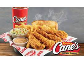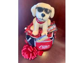 Raising Cane's Gift Basket includes: Raising Cane's branded lunch / 6-can cooler with adjustable strap & outside mesh pockets. 1 Free Meal Gift Card, 1 Free Drink Card, refrigerator magnet, lip balm, and plush "Cane" dog / toy. (Any location)