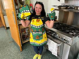 This colorful apron with matching pot holders and kitchen mitts adds a perfect handmade touch to your kitchen.