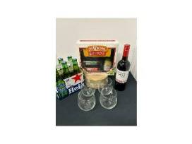 Cheese and sausage tray, Fre Red Blend, 6 pack of non alcoholic Heinken beer, Gin and Bourbon, Kentucky 74 Bourbon Cocktails and Ritual Gin Alternative.