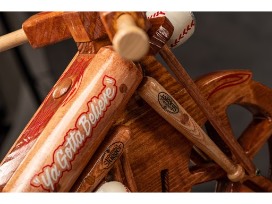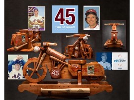 A one of a kind wooden rocker created from the vision and talents of artist Shawn Frady. This unique item is the perfect addition to your collection! Includes custom Tug McGraw details and an autograph from Tim McGraw. Bottle of Selah Wine.
