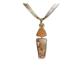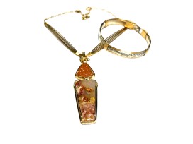 A beautiful collection of handmade jewelry created by local designer, Ava Designs. A Drusy Agate and Regency Rose Agate Wire-Wrapped Necklace with 14kgf Wire and a Wire-Wrapped Bracelet in Sterling Silver Pattern Wire and 14kgf Wire. Bottle of Selah Wine