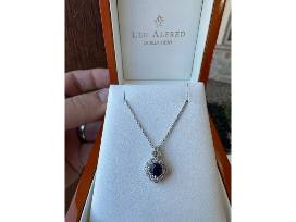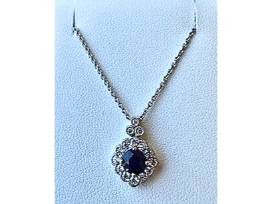The winner of the Luxurious Leo package will receive this one-of-a-kind, 14kw prong set round Sapphire with bead set cushion shape halo pendant, set with a 14k, 2mm cable chain necklace.
