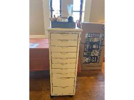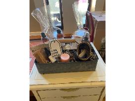 Take this beautiful white storage piece (on wheels) with a basket full of locally made skin care products.