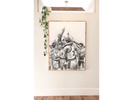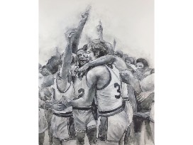 GO CATS! This exquisite mixed-media painting by Louisville artist, Hannah Burkhart, pictures the winning moment of the 1978 UK Wildcats Championship. Measurements: 48" x 36"