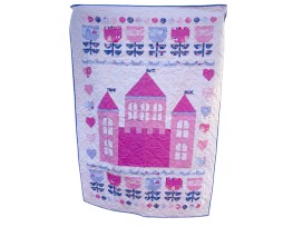 The beautiful quilt features a stitched castle with precious tulips and hearts.